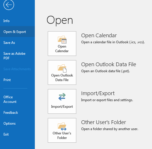 1) Navigate to FILE >> OPEN & EXPORT >> Open Outlook Data File.