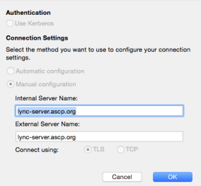8) Select the "Manual configuration", and input the "lync-server.ascp.org" address for both the internal/external server names.