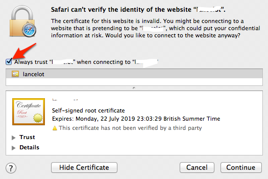 4) *** Make sure to click on the "Show Certificate" button, and check the "Always trust ... when connecting to ..."