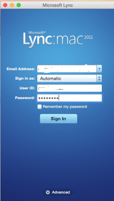 7) Now open Lync 2011 and input your logon details. Before clicking on the "Sign In" button, click on the "Advanced" button near the bottom.