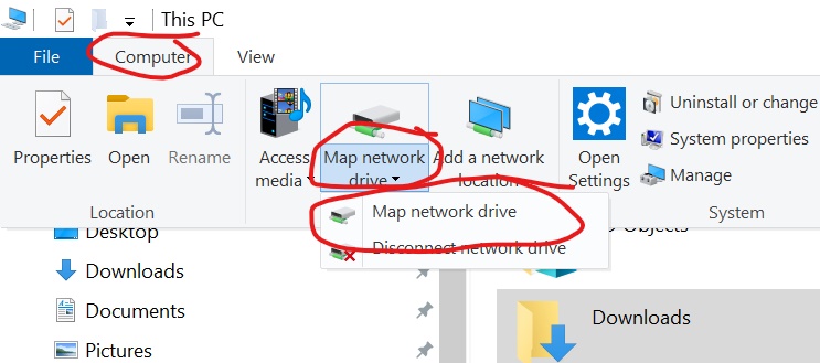 2) Click the Computer tab, then click the dropdown menu on the Map network drive tab, then click Map network drive.