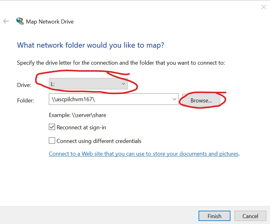 3) In the pop-up window select the drive letter you would like from the drop-down menu, enter the file path of the network share folder you would like to map. You can type out the entire file path of the network share folder you would like mapped, or you can enter the server's name and click the Browse button to see a list of available network share folders on the server selected.